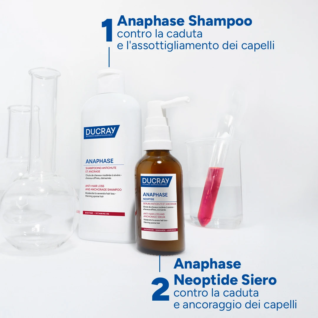 Ducray Anaphase+ Shampoo può essere utilizzato come complemento ai trattamenti contro la caduta dei capelli, indipendentemente dalla sua origine (occasionale o progressiva).
