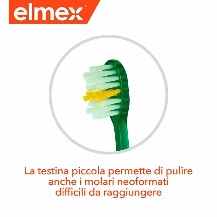 Lo spazzolino elmex Junior presenta una testina piccola e setole disposte a X per una pulizia accurata durante il periodo della dentizione mista.