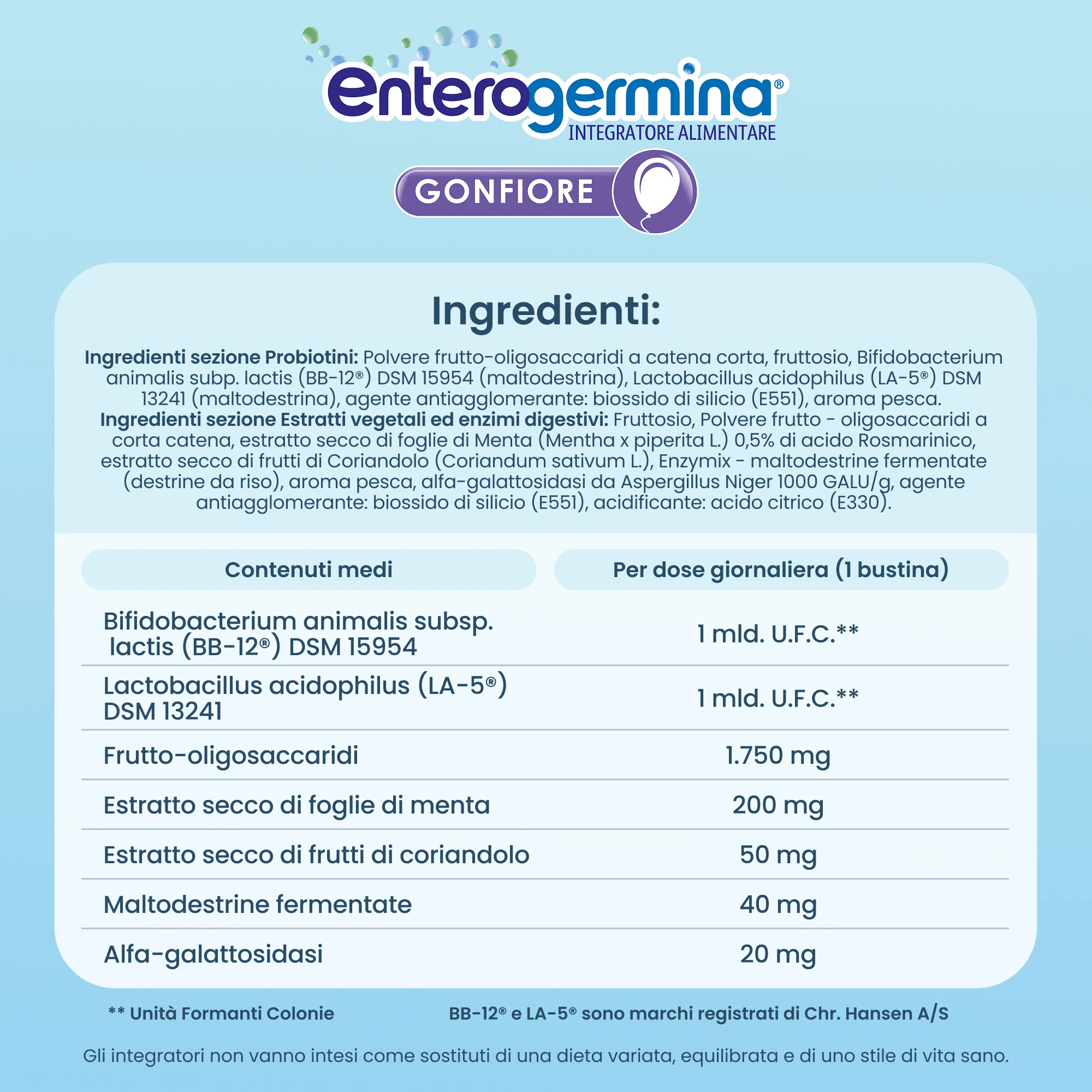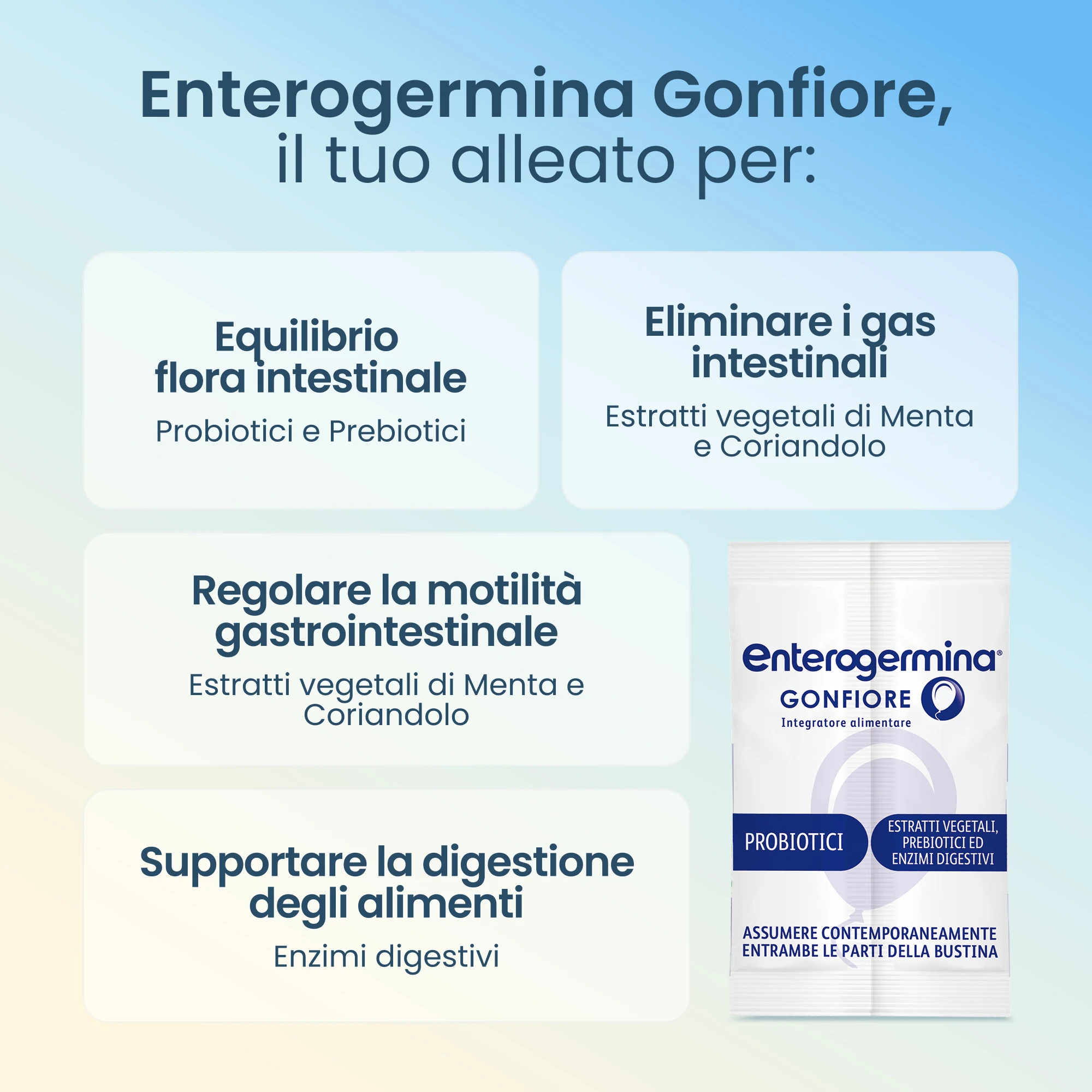 L’aria in eccesso nell’intestino provoca spesso situazioni di disagio meglio percepite come gonfiori intestinali. Enterogermina Gonfiore è un integratore alimentare senza glutine e senza lattosio, a base di fermenti lattici, probiotici, estratti vegetali ed enzimi digestivi ad azione rapida e prolungata contro la pancia gonfia. I probiotici BB-12® e LA-5® favoriscono l’equilibrio della flora batterica intestinale, mentre gli enzimi digestivi svolgono un ruolo fondamentale nella digestione degli alimenti, perché accelerano e catalizzano le reazioni chimiche. Gli estratti vegetali di menta e di coriandolo aiutano a ridurre il gonfiore addominale e a regolare la motilità intestinale. L’estratto di coriandolo funge anche da acceleratore del metabolismo dei carboidrati. Le bustine di Enterogermina Gonfiore sono integratori che aiutano ad avere una pancia piatta, grazie all’eliminazione dei gas in eccesso presenti nell’intestino. La confezione contiene 10 bustine per adulti. Assumere sempre il contenuto di entrambe le parti della bustina, facendole sciogliere in ½ bicchiere d’acqua, preferibilmente prima del pasto principale. Non superare la dose giornaliera consigliata.