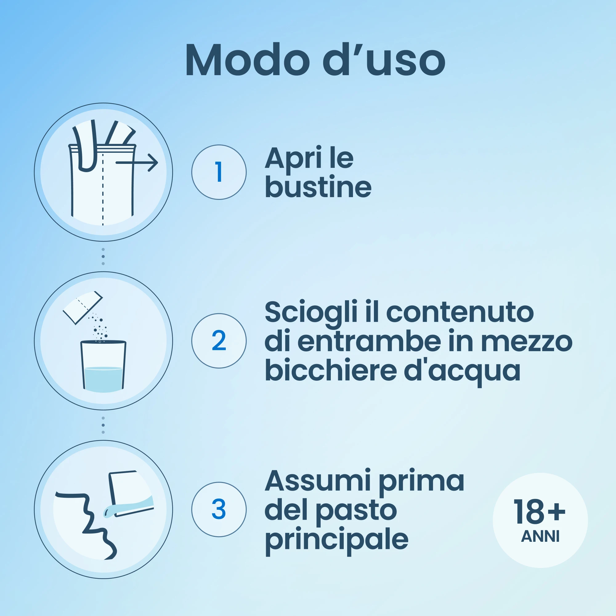 Sciogliere il contenuto di entrambe le bustine in mezzo bicchiere d’acqua, bere la sospensione ottenuta preferibilmente prima del pranzo principale.