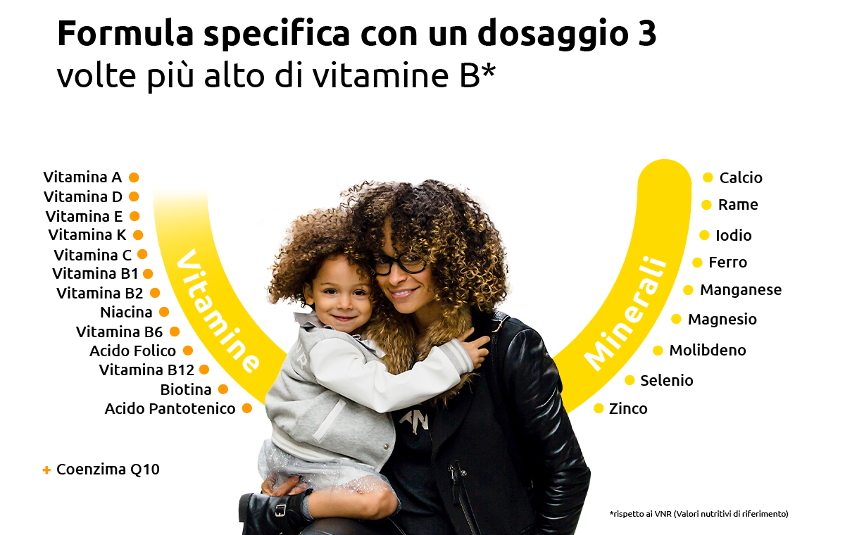 È un’integratore alimentare di vitamine e minerali con edulcoranti utile in caso di stanchezza fisica e mentale, formulato per assicurare un adeguato apporto giornaliero di micronutrienti nei casi di aumentato fabbisogno fisiologico o di ridotto apporto con la normale dieta. Al suo interno ci sono 13 vitamine, 9 minerali e Coenzima Q10.