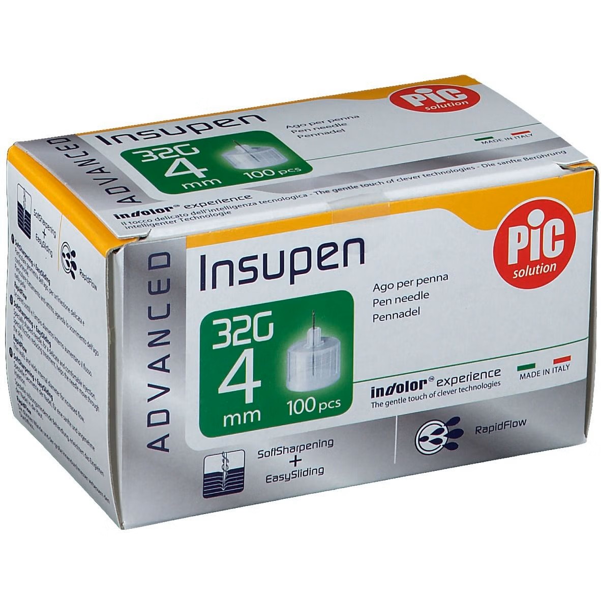 Pic Insupen G32 4 mm sono aghi per insulina. Hanno un diametro esterno ridotto, alle pareti sottili e ad un trattamento lubrificante, gli aghi penna della gamma Insupen consentono di effettuare un’iniezione confortevole.